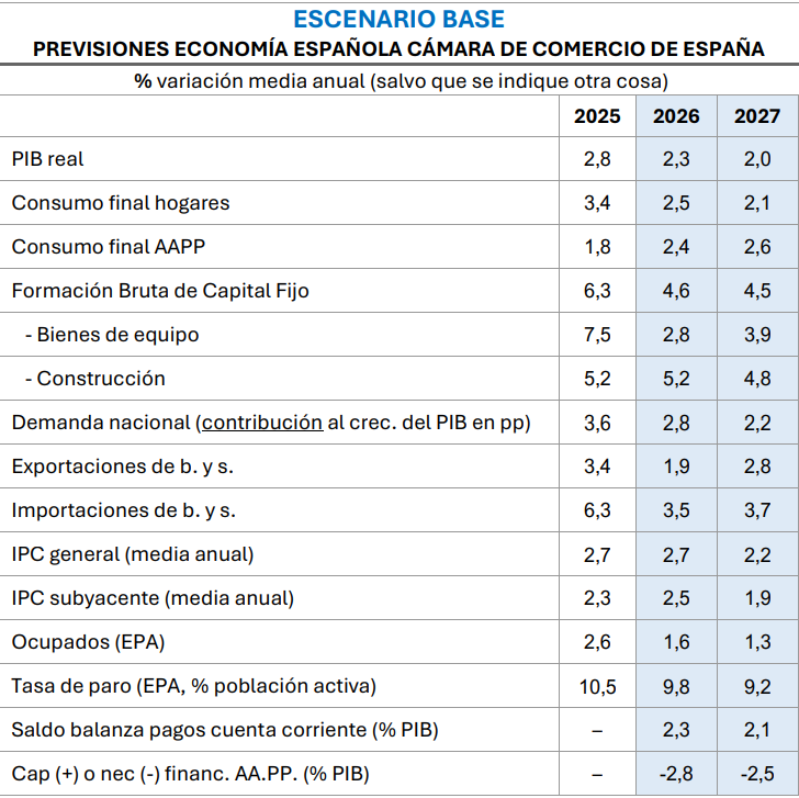 La Cámara de Comercio de España prevé que la economía española mantenga la senda del crecimiento en 2026 y 2027, con un avance del PIB del 2,3% en 2026 y del 2% en 2027, apoyado principalmente en la fortaleza de la demanda nacional, gracias al dinamismo del consumo y la creación de empleo.