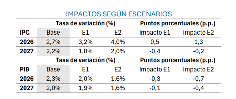 Estos escenarios permiten cuantificar con mayor precisión los riesgos asociados a un conflicto bélico que, aunque concentrado geográficamente, tiene implicaciones globales. De esta forma, se contemplan dos escenarios adicionales, que estiman el impacto directo de la evolución del precio del petróleo sobre el PIB y la inflación.